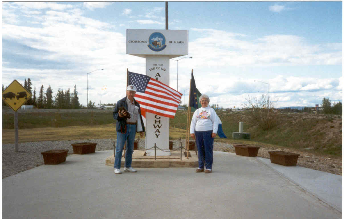 May 25, 1999. We are shown at the northern end of the world famous Alaska HWY at Delta Junction, Alaska. This is Mile 1422. We videotaped all 1422 miles of this famous highway on this trip. It took us 28 hours of taping with an 8MM Sony Camera. It was powered by the vehicle electrial system. We transferred these tapes to VHS tapes and also DVD disks. If anyone who views this website would like to acquire VIDEOS or DVDS of the ALASKA HIGHWAY, PLEASE CONTACT ME at: Reebax@Aol.com |
