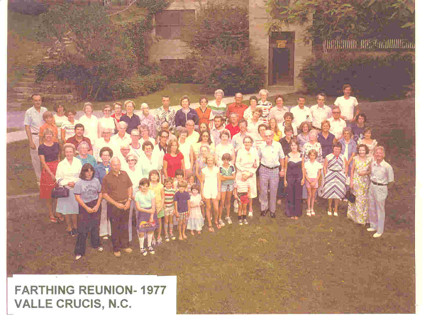 Photo made at the 1977 FARTHING REUNION at the Episcopal Diocese complex at VALLE CRUCIS, N.C. This is the annual reunion of the descendants of WILLIAM JUDSON FARTHING and LAURA GREER FARTHING of Watauga County, N.C.