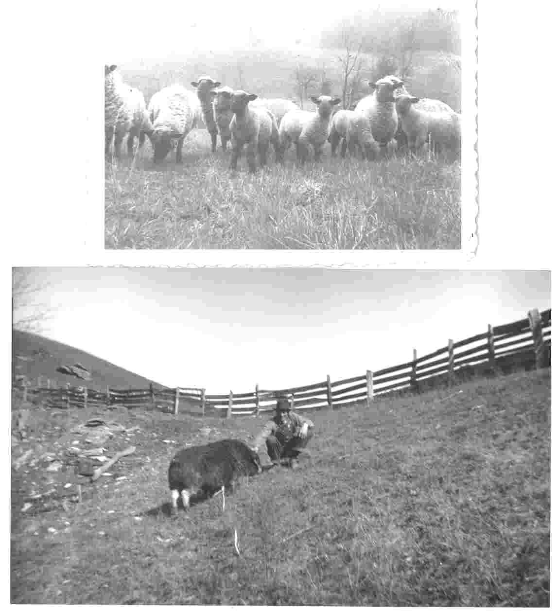 Mid-40s photo features some of our sheep flock in upper photo. Lower picture shows my dad with on of our hogs.