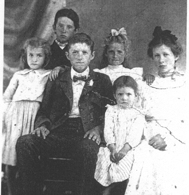 This photo shows the first 6 children of Wm. and Laura Farthing On the left is GLADYS (born 1898 )AUBYN (born 1893 ) My father, BENJAMIN ( born Dec. 1889, first child ) DELIA ( born 1896 ) On right is STELLA ( born 1891 ) At front is ELSE ( born 1901 ). These six children were born before my Grandparents moved to this 170 location. THOMAS was born here 1903 and GEORGE, youngest, was born here 1906. Photo, courtesy, first cousin, Jimmie F. Mast |