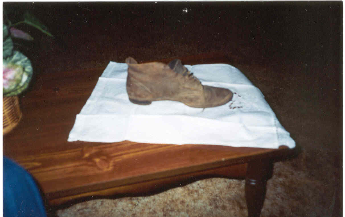 This long ago photo shows one of a pair of home-made leather shoes that were made by Grandfather William Farthing. As pointed out previously on this website, he was able to do many of the things that people had to do in that early era in order to survive. This pair of self-made shoes was presented to a museum in Boone N.C. | ||||