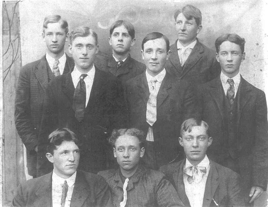 This photo, from the 1907 period, was taken in Boone, N.C. about the time that my father, Ben W. Farthing, graduated from the only high school facility in Watauga County, N.C. ( The school was known as "APPALACHIAN TRAINING SCHOOL"). BEN W. FARTHING ( born 1889 ) is shown, sitting at the left front. Immediately behind him is MARSHALL GLENN, my mother's oldest brother ( born 1888 ). Marshall Glenn and Ben Farthing were second cousins,( their mother's were FIRST COUSINS). Can anyone identify any of the other 7 men in this photo ?? This long ago facility today is the APPAPACHIAN STATE UNIVERSITY with 15,000 students !! |